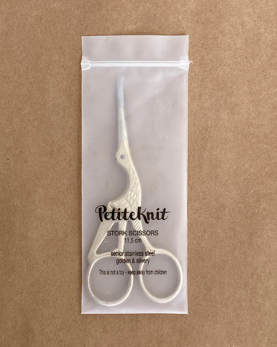 Paire de ciseaux de forme “cigogne”, dorés et pointus, de la marque PetiteKnit. Tient parfaitement dans n’importe quelle petite trousse d’accessoires.
