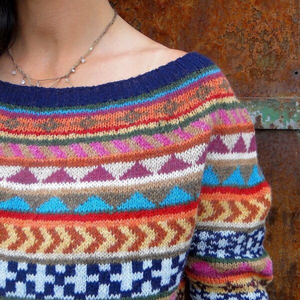 Cadence est un modèle de pull en jacquard top-down, tricoté en rond. C’est un travail rythmé, incluant une succession de motifs variés dans de magnifiques couleurs. Des croix, des flèches, des triangles, des rayures, bref aussi amusant à tricoter qu’à porter ! C’est un clin d’oeil aux jacquards audacieux des années 80, revisité dans une forme moderne et flatteuse. Il se tricote d’une seule pièce en partant du col et en augmentant progressivement le nombre de mailles pour former les épaules. Le travail est ensuite séparé pour former le corps puis les manches. Des rangs raccourcis optionnels sont proposés pour remonter la nuque abaisser le bas du dos.