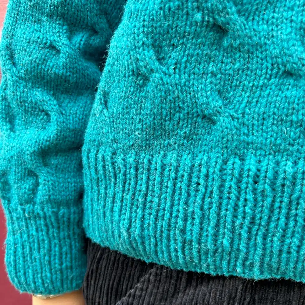 corps, bordures, manches et poignets (tissus principal) : aiguilles circulaires de 5 mm en 40 cm et 80 cm, ou la taille d’aiguilles nécessaires pour obtenir l’échantillon ci-dessus