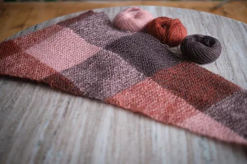 Le châle Llosa de Belén Fernández (alias Tejer en Inglés) est un châle triangulaire assez simple. Vous commencez par une pointe en augmentant graduellement jusqu’à la moitié, et après vous diminiez jusqu’à l’autre pointe. Dans ce châle vous jouez avec les couleurs pour créer les carrés. Il se tricote en double fil, en changeant un des deux brins tous les x nombres de rangs ou de mailles. Il produit un effet de couleurs assez agréable à tricoter!