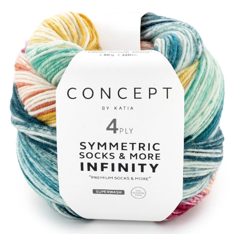 Les pelotes de Symmetric Socks & more – Infinity de Concept by Katia permettent de tricoter une paire de chaussettes dans un dégradé de multicolor entrecoupé de petites rayures de couleur écrue. Avec une pelote on obtient une paire de chaussettes jusqu’à une taille 43-44, sans restes.
